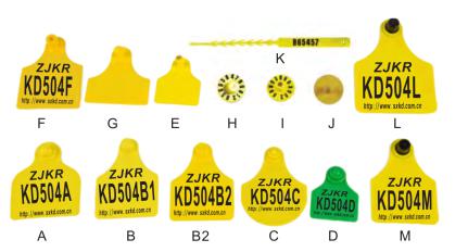 red ear tag, yellow ear tag, blue ear tag,orange ear tag.