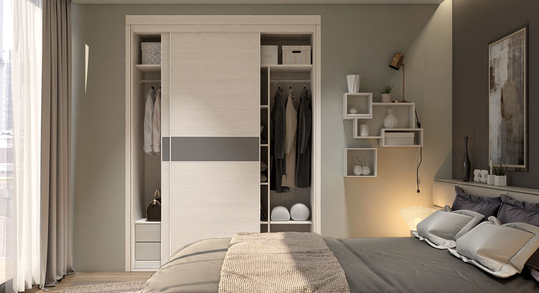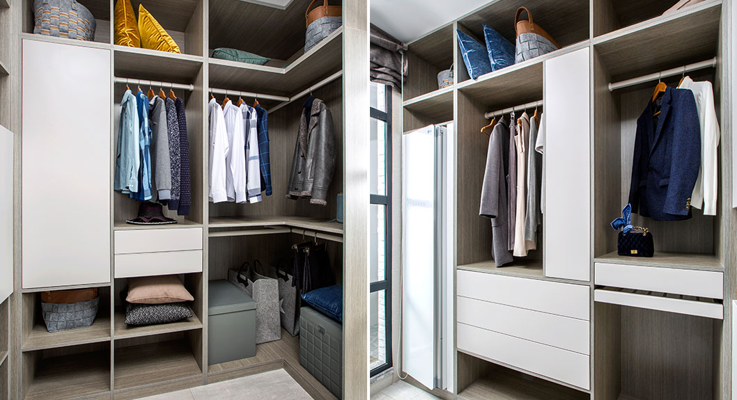 This contemporary bedroom wardrobes layout makes efficient use of space, looks neat and can be very sociable.