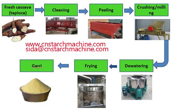 The garri processing plant  process flow chart is include : Selection section; Cleaning section ; Peeling section ; Crushing section ; Dewatering section ; Frying section ; Cooling and pac…