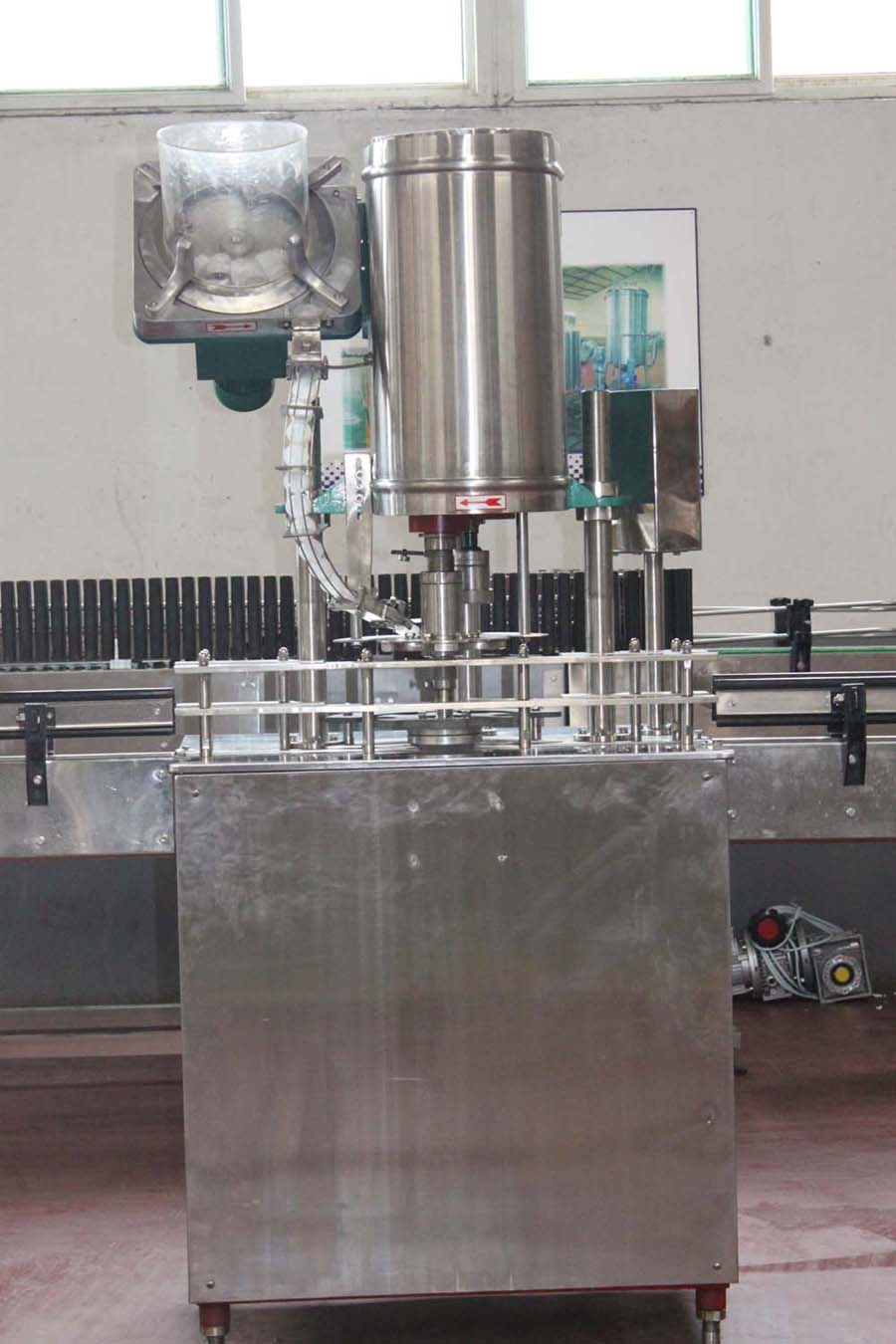 Conveyor belt will put needed cleaning bottles into the bottle screw,due to the bottle inputting screw and star wheel catch plate are continuously operating in-phase which will synchronously convey th…