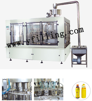 The equipment is used in production of non-soda drink of mineral-pure water packed in polyester bottles. Washing, filling and capping are integrated in one machine.