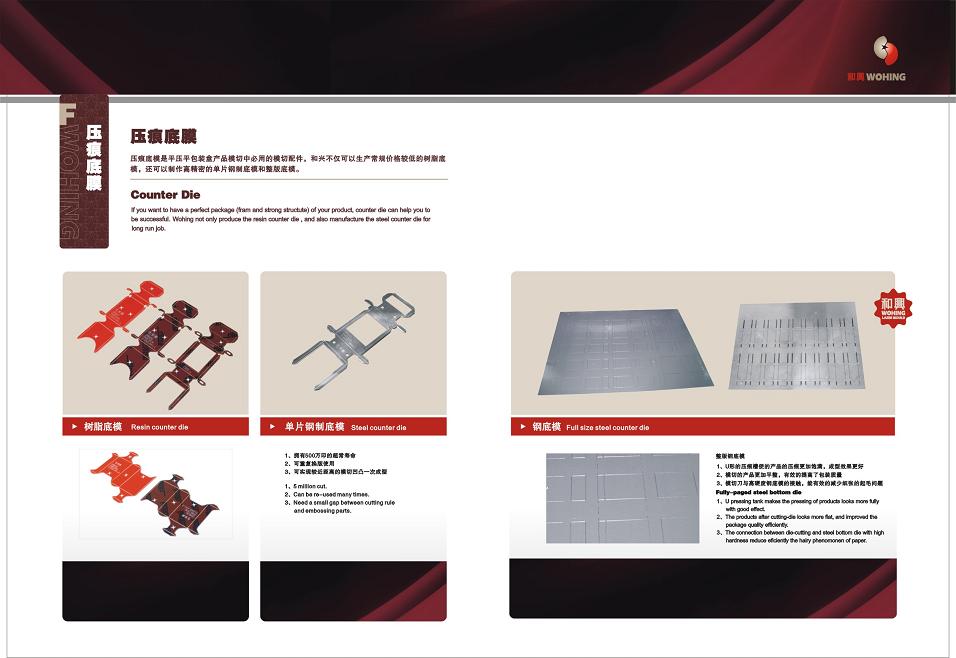If you want to have a perfect package (fram and strong structute) of your product, counter die can help you to be success. Wohing not only produce the resin counter die , and also manufacture the stee…