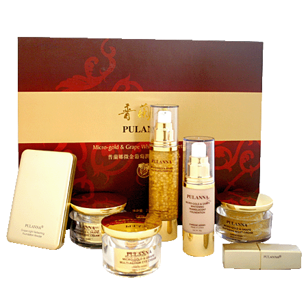 micro-gold grape whitening cosmetics set .specially added micro-gold particles ,grape extract,marine polysaccharide ,arbutin and hyaluronic acid help to activate and nourish skin cells ,improving a du…