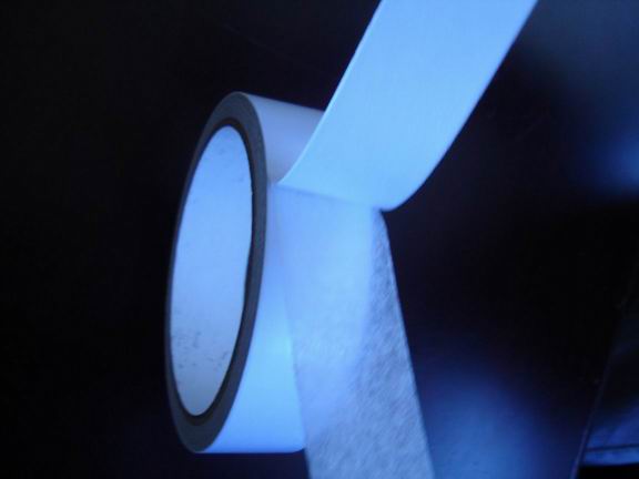 Thick white double-sided self-adhesive tape consisting of a PVC-film backing and a tackfied acrylic adhesive.