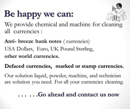 We supply SSD CHEMICAL SOLUTION and ACTIVATION POWDER specialized in cleaning and activating all types of defaced banknotes, black banknotes, anti-breeze, stamped, colored, marked or stained currency.…