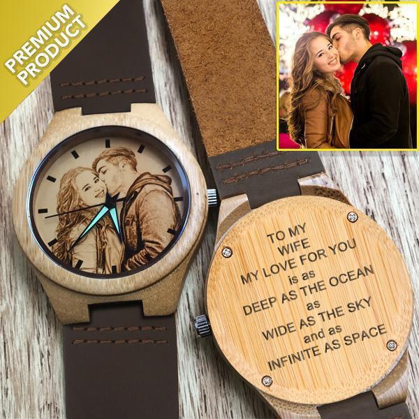 To My Wife - Custom Engraved Bamboo Photo Watch Leather Strap 40mm