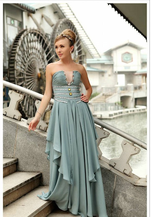 This matte, sage-colored strapless gown features a U-front slit lined with embroidery and amber and golden embellishments. The ruffled layers of composite silk and stretch silk satin give this evening…