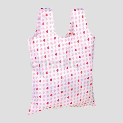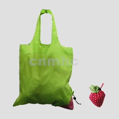 A reusable shopping bag can be folded into a seamed pocket of a strawberry shape.
