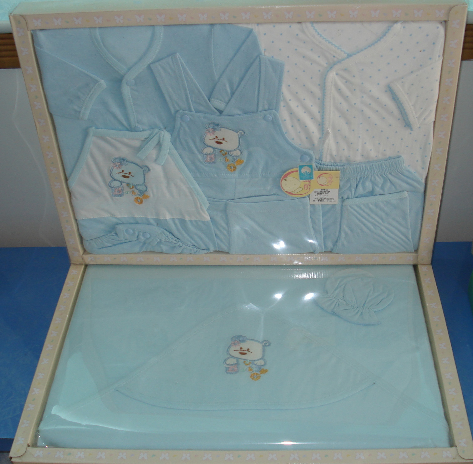 Product:Baby cloth set including baby shorts-sleeved bodysuit,pants,matching hat,shoes and gloves.