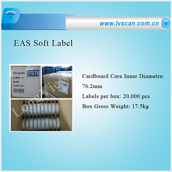 EAS Soft Label Dimension: 30*30mm or 40*40mm or 50*50mm (not common) Centre frequency: 8.2MHz±0.5 Outer color: bar code or black Quantity per roll: 1000PCS Packing dimension: 39*38*24cm…