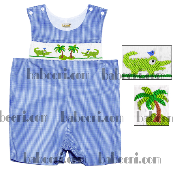 Feature: An adorable shortall with exquisite hand smocking embroidered patterns of palm trees and alligators