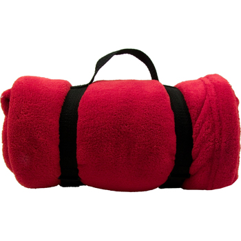 A warm, super soft and cozy blanket. Edges fold double needle. Nylon carrying strap included.