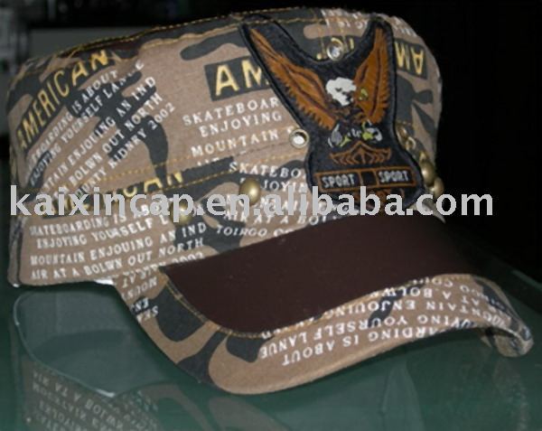 three brass eyelets,six metal nail,flat embrodier patch,leather applique on visor,printed letters accross cap.one size