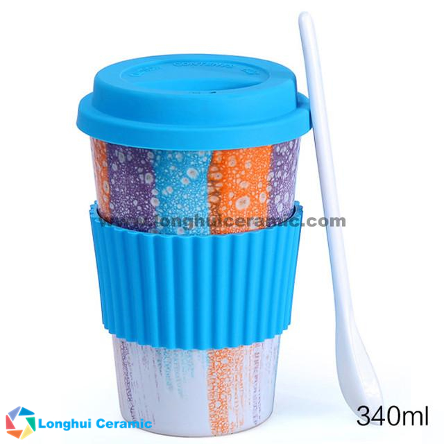 340cc glaze brushed ceramic couples coffee mug with lid and spoon