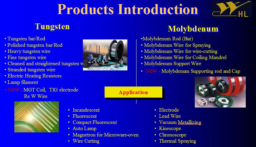 We manufacture tungsten and molybdenum since 1992 in China; we are one of the biggest tungsten wire manufacturers in the world. We are ISO 9001:2000 certificated. We produce: