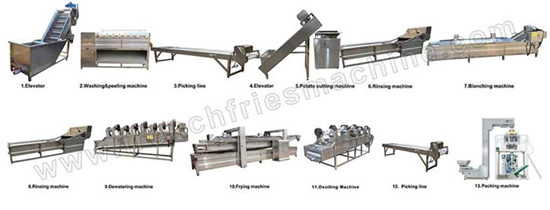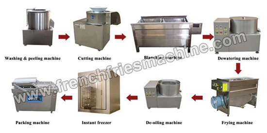 Fully automatic Frozen French Fries Production Line is to produce frozen French fries from fresh potatoes. Output: 350-400 kg/h, 600-700 kg/h, 1000-1200 kg/h.