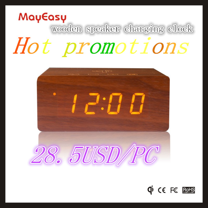 best gift wooden led alarm clock with bluetooth speaker and QI charger