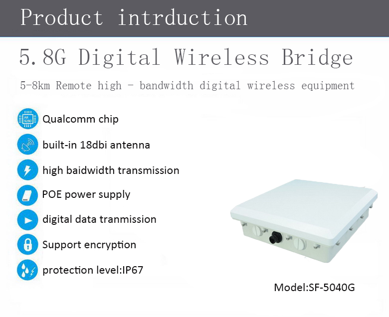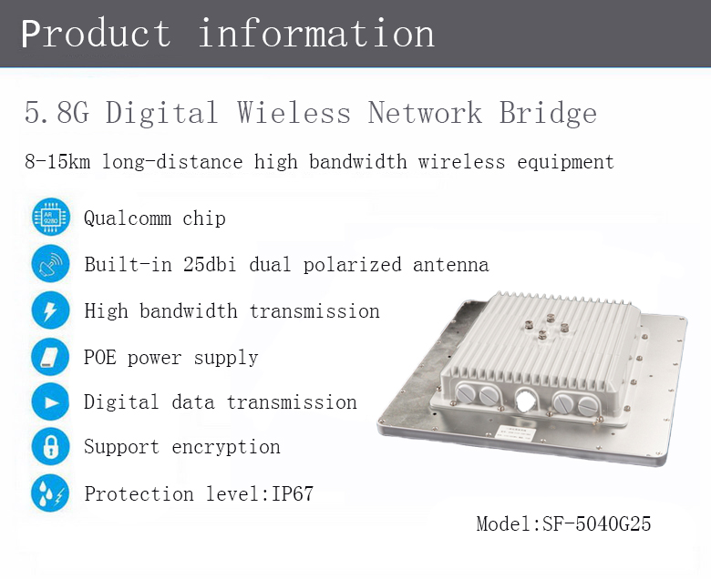 Description:SF-5040G25 high power outdoor wireless bridge is very suitable for the wireless internet connection under the wild environment,it satisfies the needs of high bandwidth network co…