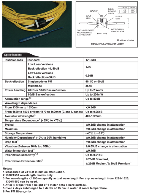Insertion Loss: Typically 2dB for multimode attenuators Backreflection: 15dB for receptacle style attenuators (BB-200 style) Attenuation Range: 2 to 80 dB with 0.01dB resolution up to 10dB, 0.1dB reso…