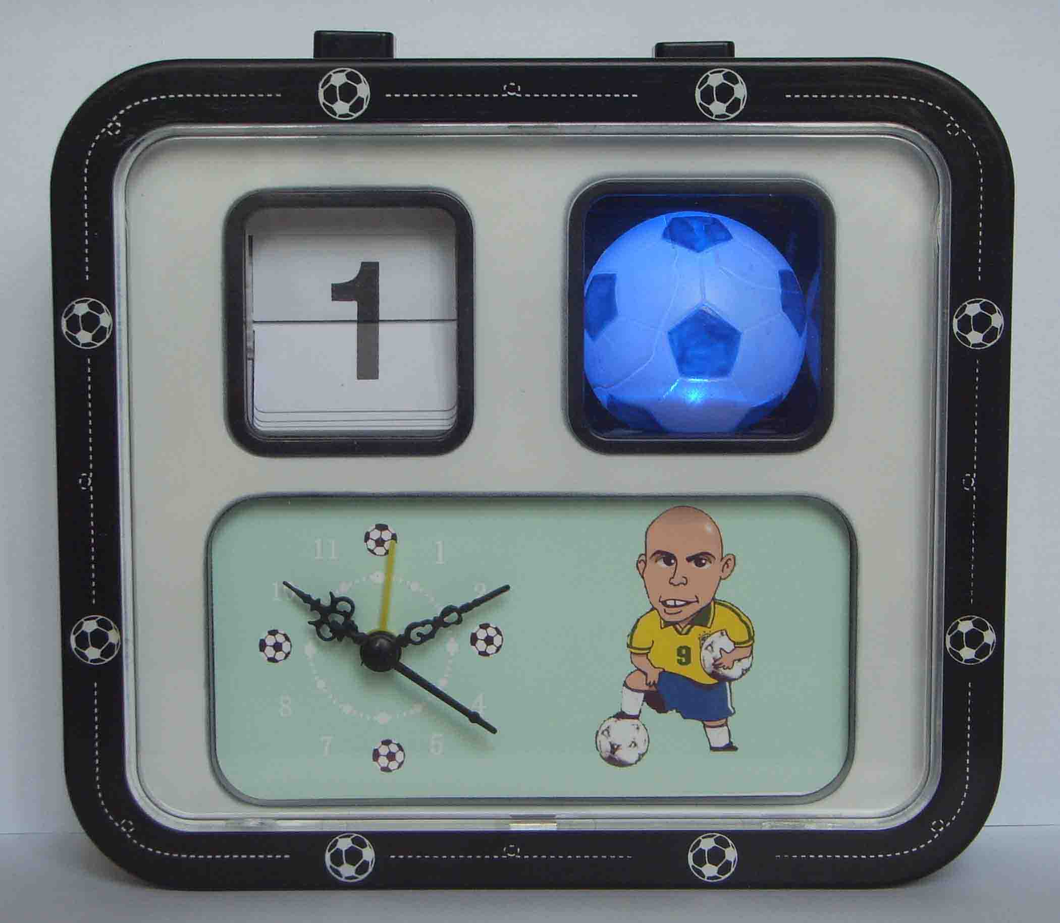 The calendar clock showes the date in the left window, in the right window is a night lamp. You can design the cartoon of night lamp. And the clock has alarm fuction. The right side of the clock can b…
