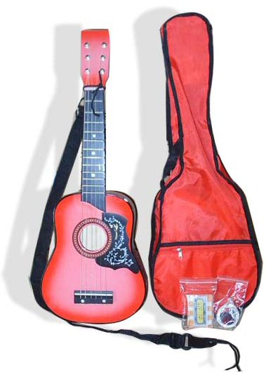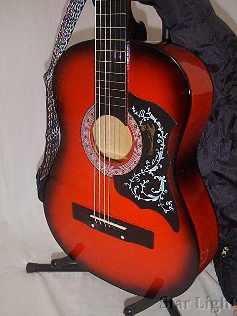 RED ACOUSTIC GUITAR + CASE, STRAP TUNER, STRING & STRAP