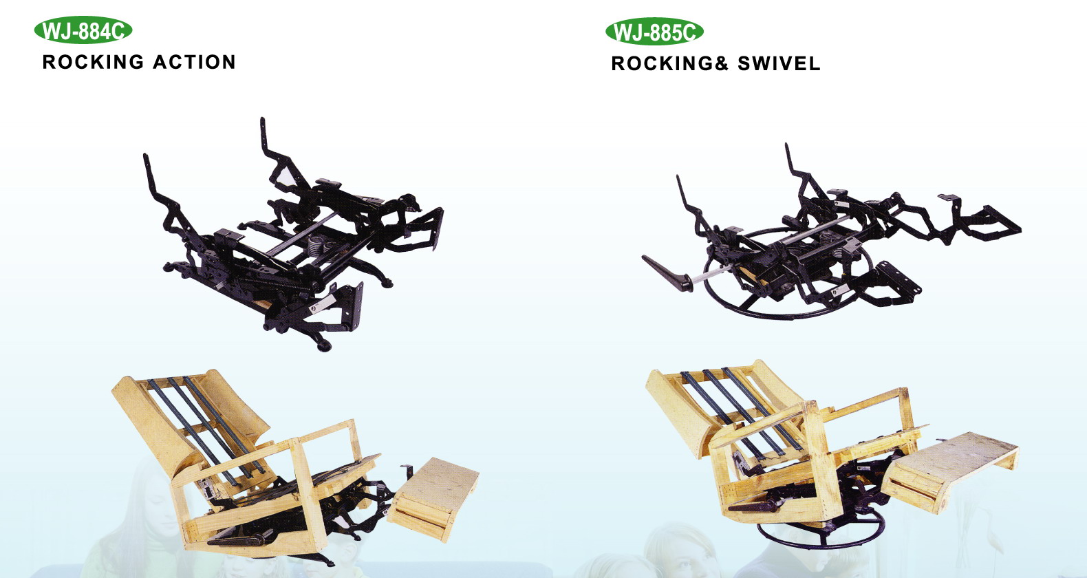 This recliner/rocker mechanism can be used in recliners and sofas with legs. The mechanism enables users to easily fold and unfold the footrest and the backrest by using handle or cable system. Reliab…