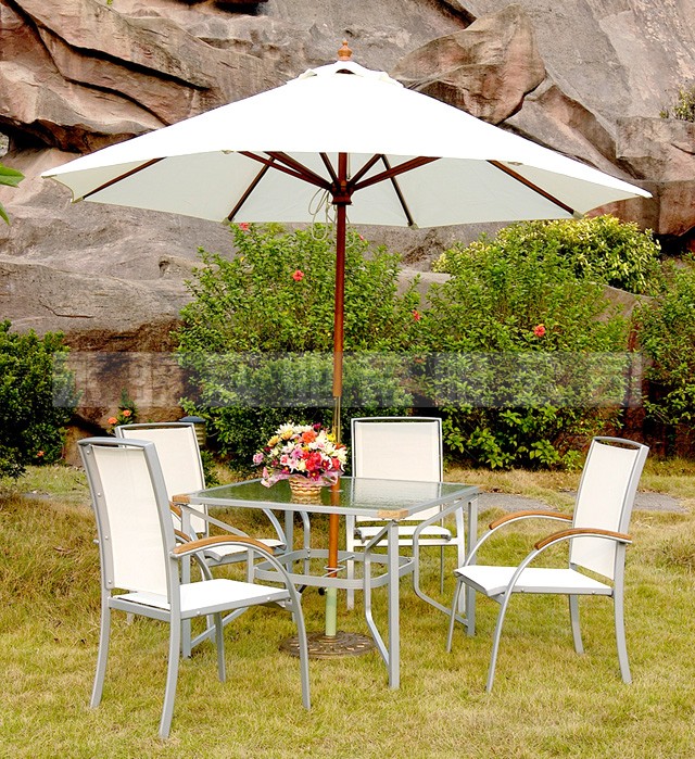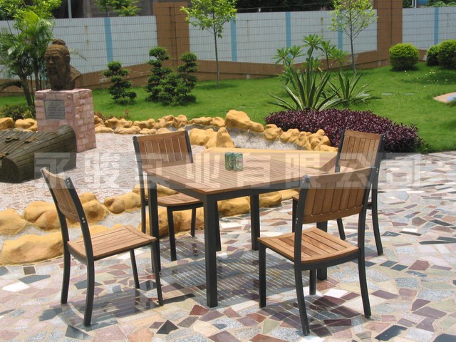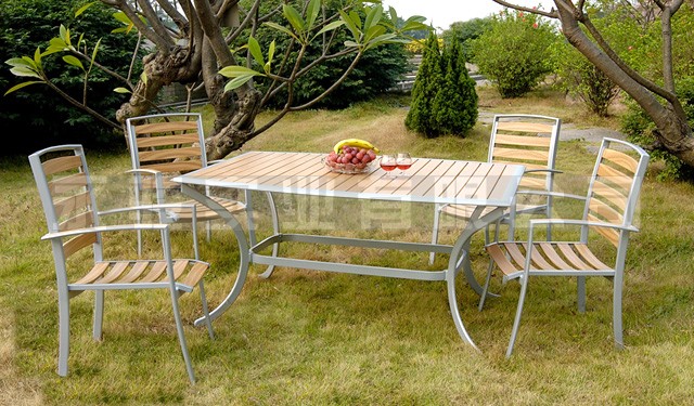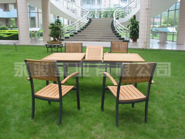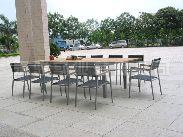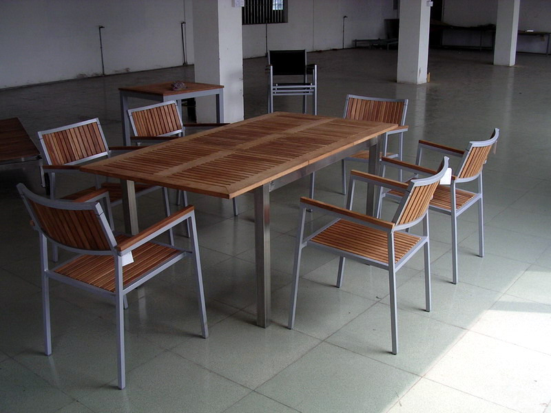 Our products are in good quality, and with reasonable price. This table is made by stainless steel and teak., and the chair is made by painted aluminium and teak. And the table can stretch out and dra…