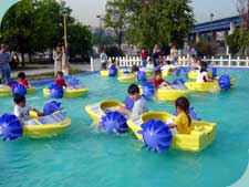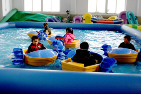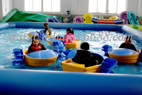 This power paddler boat is in the inflatable pool o…