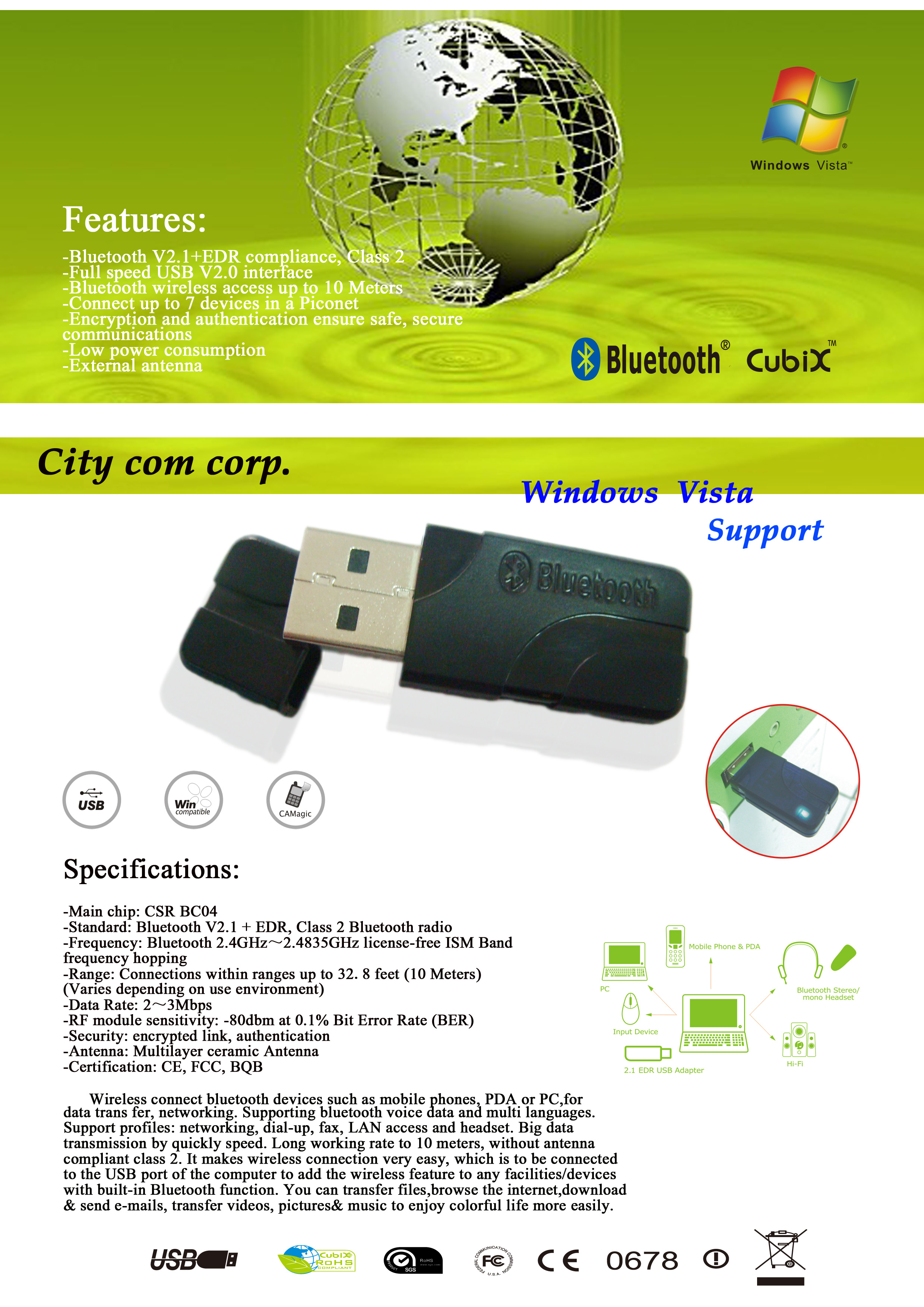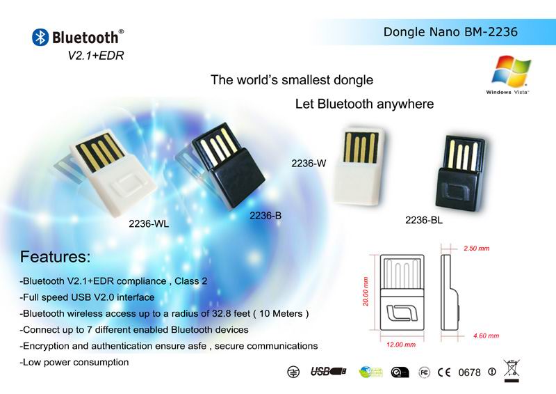Features: -Bluetooth V2.1+EDR compliance, Class 2