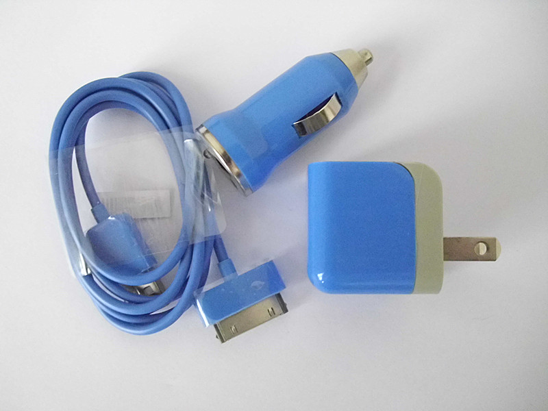 Blue Car Charger + Wall Charger + USB Data Cable for iPhone 3GS 4S iPod Touch