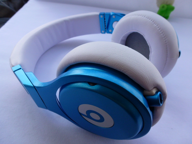 White and Blue monster pro headphones by dre with deep lows.