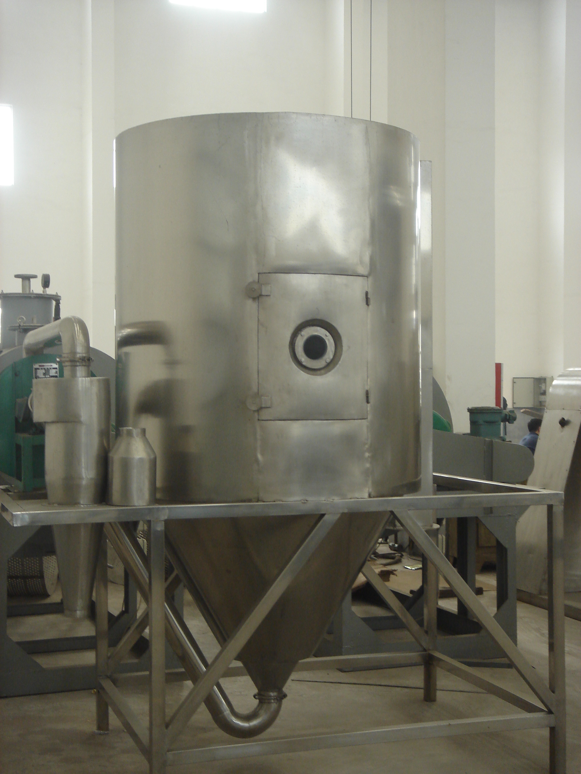 After fresh air is filtered and heated, it enters into the air distributor which on the top of the drier. The hot air in spiral form equably enters into the drying room. When liquid raw m…