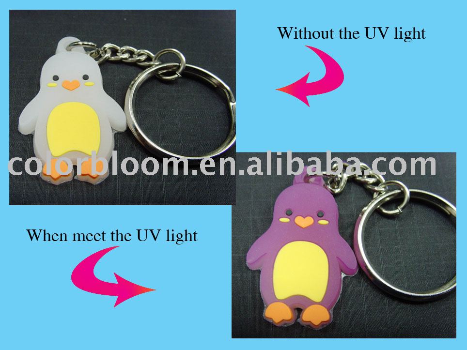 The soft pvc keychain changes color with uv light/sunshine outside.