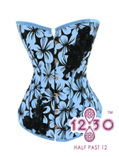 Asymmetric blue saten and black lace corset. Finished with beadstone applications, tull and black roses printed one at a time.