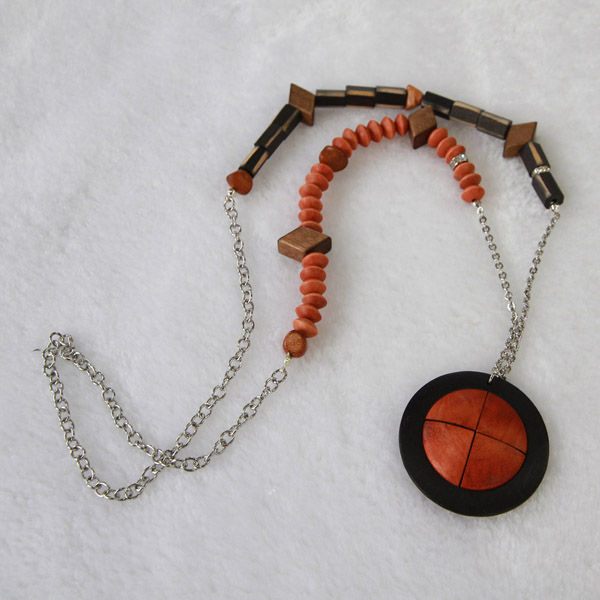 Beautiful, bright color necklace, it is a combination of wood, stone, thread and metal.