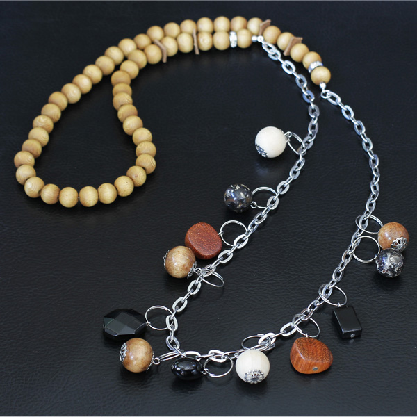 Comfortable, natural wood necklace, it is a combination of wood, leather, rhinestone ring, stone, agate and stainless steel.