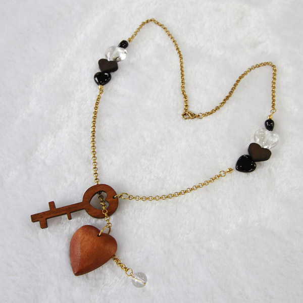 Comfortable, natural wood necklace, it is a combination of wood, rhinestone ring and stainless steel.