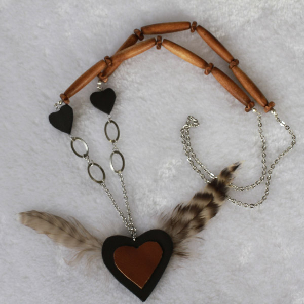 Wood necklace with sculptured pendant. Stainless steel chain and leather.