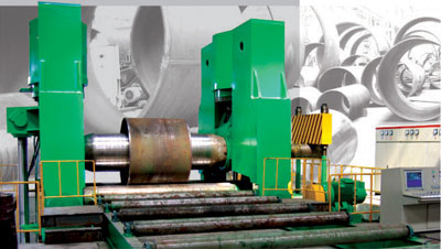 This machine is a hydraulic three-roller bending machine and used to prebend the end of plate material, roll it into