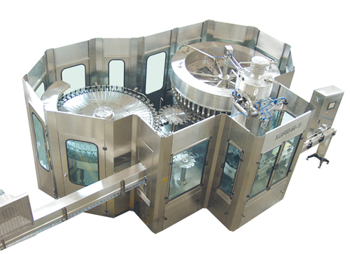 The equipment is used in production of non-soda drink of mineral-pure water packed in polyester bottles. Washing, filling and capping are integrated in one machine.