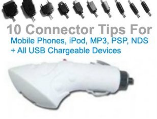 Universal car adapter for rechargeable MP3 players, mini iPods, digital camera's, Bluetooth headsets and other USB devices