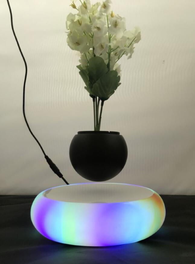 Base size:183*183*55mm Floating object weight: 0-300gram pot color: green,purple pot size:8.5*8.5*8cm floating distance:15-20mm base material:plastic with led light AC Adapter:DC Output 12V, 1500mA