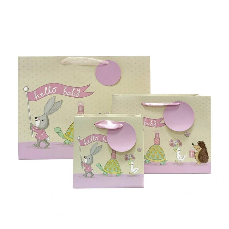 Product Description of Printed Paper Bags:Item No. FH - B0024 gift bag is made of white cardboard with a matte lamination process. It has a light - pink background with cute patterns, perfec…