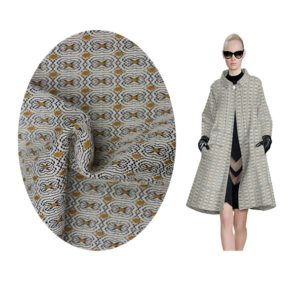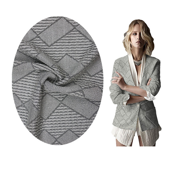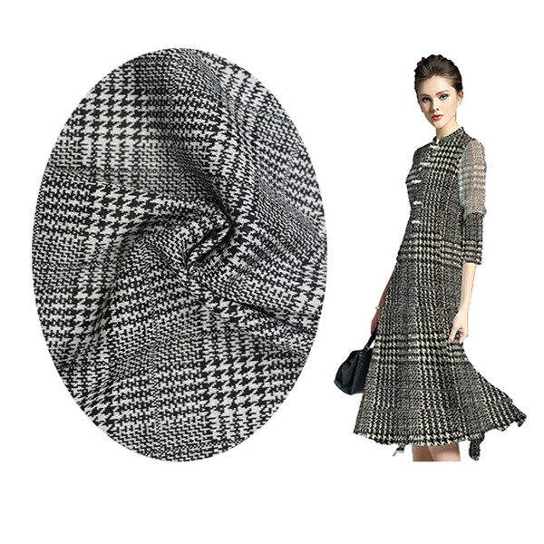 Sixty-seven percent of polyester thirty percent of rayon three percent of spandex black and white case jacquard fabric.The width is 150cm and the weight is 290gsm.