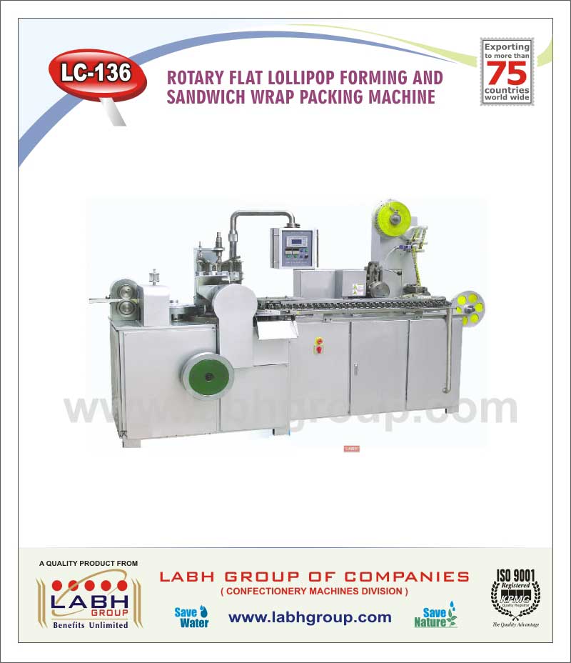 Rotary flat Lollipop Forming and Sandwich wrap packing machine to form flat Lollipop with automatic stick insertion and pack it in Sandwich type packing