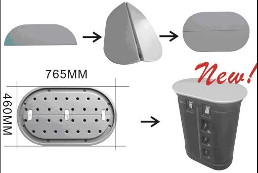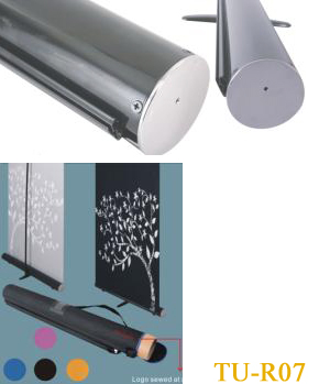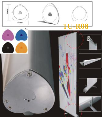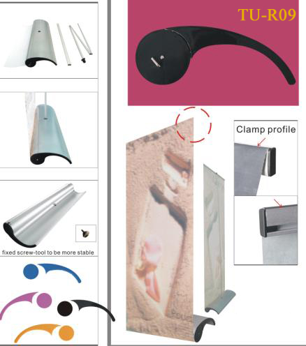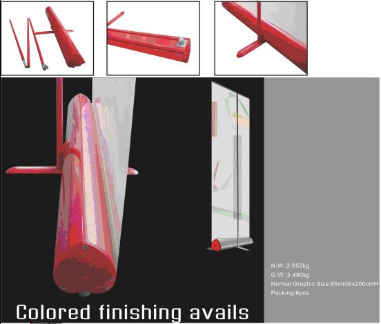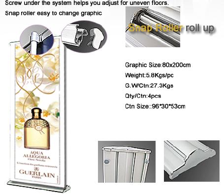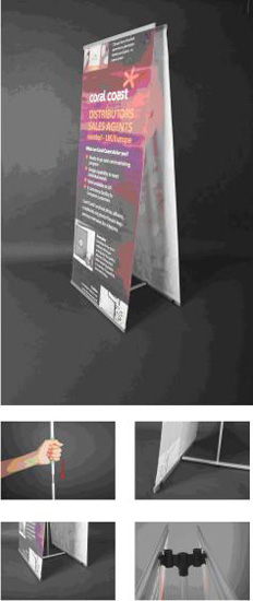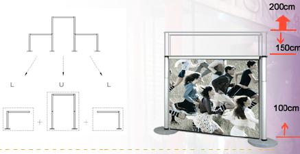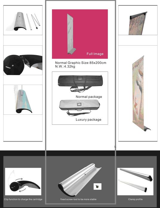 Simple assemble for double sided use, and the pole inside has spring machenism to press down, so that it is easy to set up graphics. No need to lean forward or back ward.