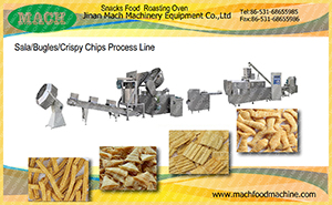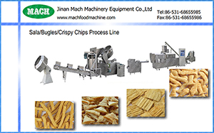 Sala/Bugles/Crispy Rice Chips Process Machines use wheat flour as raw material through twin screw extruder and use forming machine by change roller to shape different shapes of products ,such as bugle…