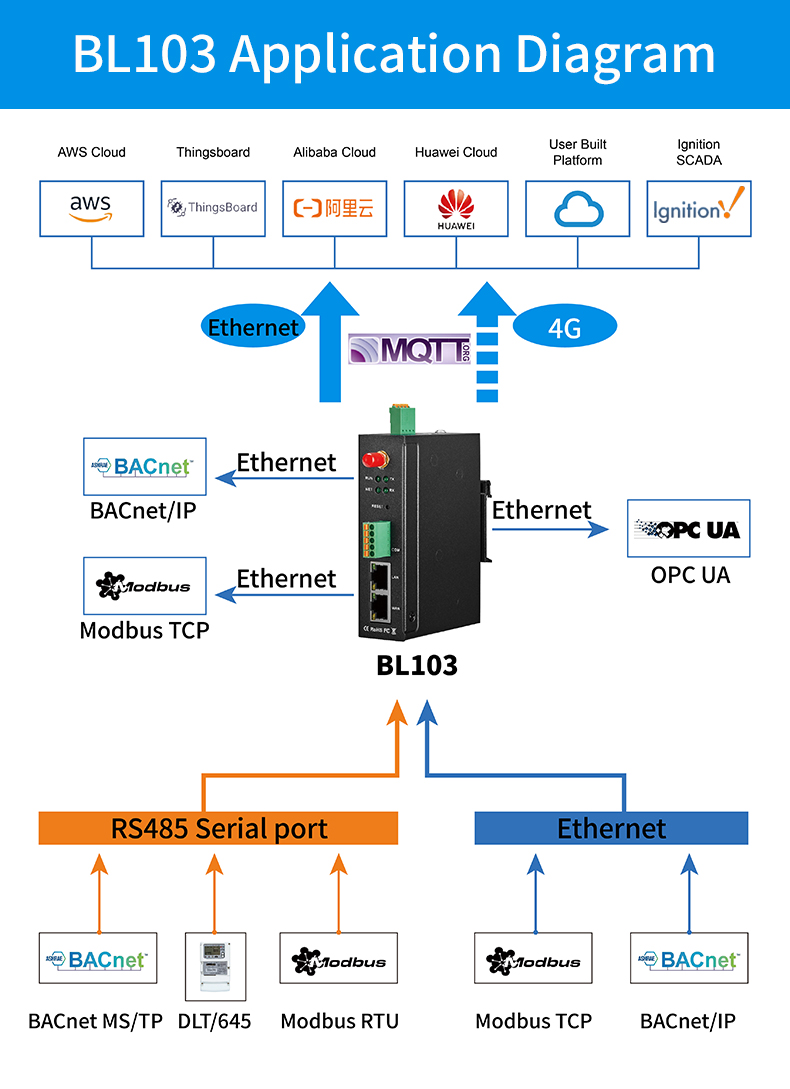BACnet 게이트웨이 BL103은 BACnet MS/TP를 BACnet/IP로, Modbus를 BACnet/IP로, BACnet을 MQTT로, BACnet을 OPC UA 프로토콜로 변환하는 데 사용되는 빌딩 자동화 및 HVAC 제어 시스템을 위한 비용 효율적인 산업용 IoT 게이트웨이입니다.