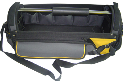 Folded sides; zipper closure with inner mobile pockets.