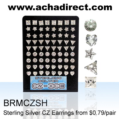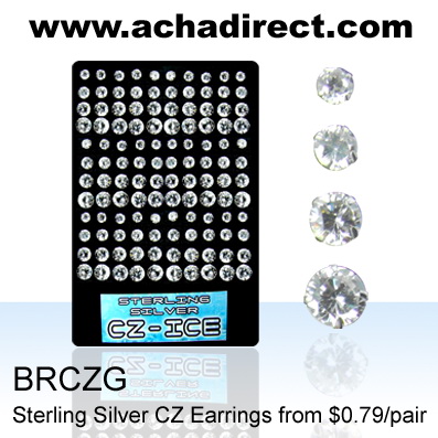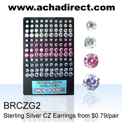 Board of 60 pairs of sterling silver CZ earrings, Round assorted round cubic zirconia, size of 5mm. - 8mm.